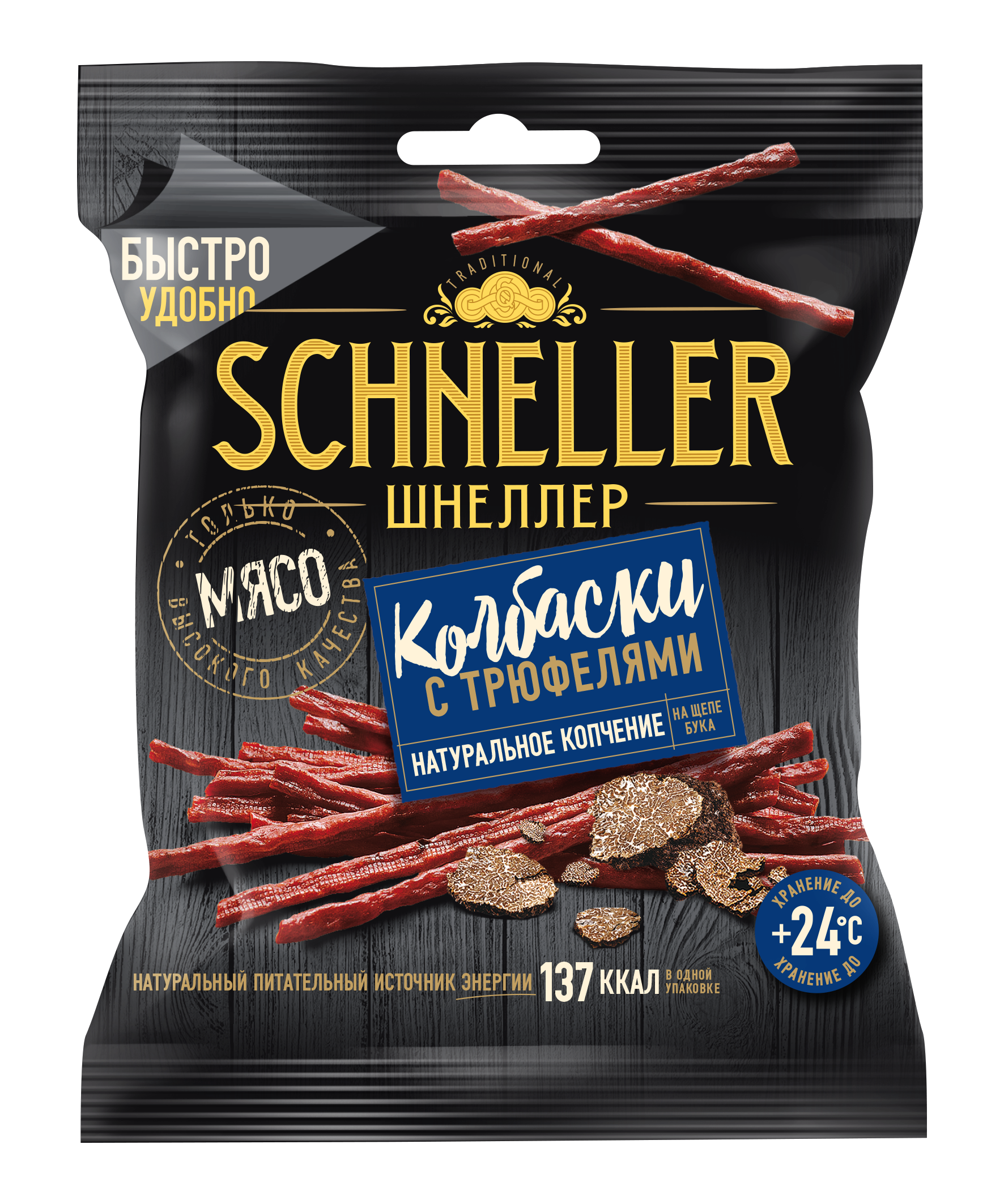 - Сырокопчёные колбаски с трюфелями – ароматные тонкие нежные колбаски с нотками деликатесного трюфеля. Яркий насыщенный вкус и удобная упаковка, которую легко взять с собой в дорогу. Отличный перекус для тех, кто ценит свое время.